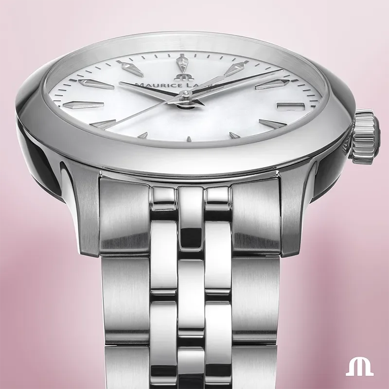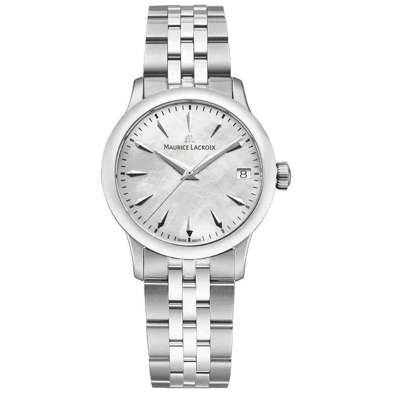 Maurice Lacroix 751006-SS002-160-1 er et raffinert dameur preget av tidløs eleganse og høy kvalitet. Med sin vakre perlemorsskive og et slitesterkt safirglass fremstår uret som både luksuriøst og robust. Dette uret har en diameter på 33 mm, som passer perfekt på håndleddet for en diskré og feminin look.