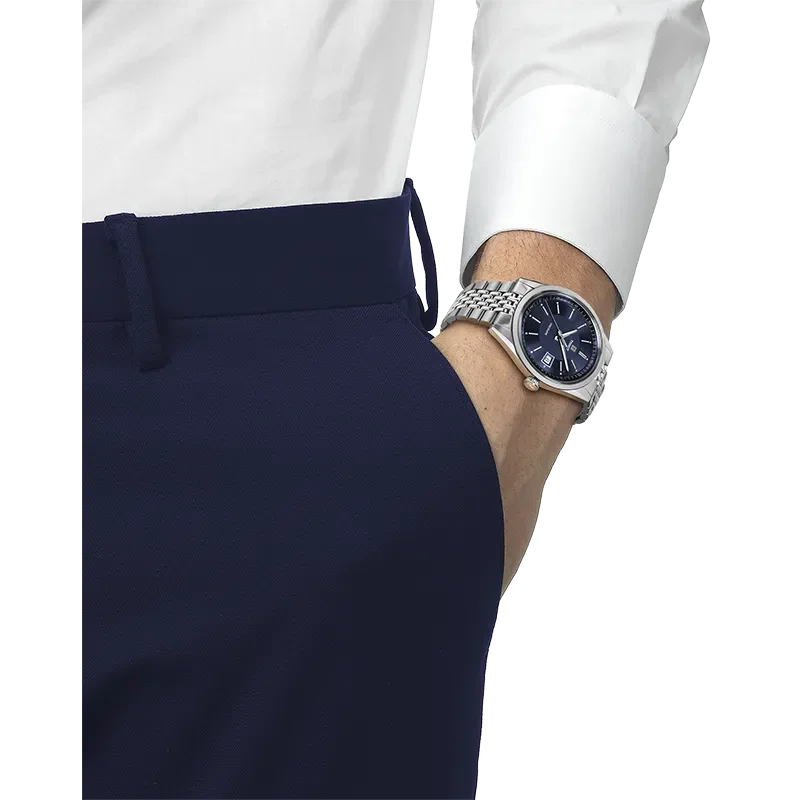 Tissot Visodate kombinerer tradisjonelt design med moderne presisjon. Denne unisex-modellen har en elegant blå urskive som gir et sofistikert uttrykk, og et holdbart safirglass som motstår riper i hverdagen.